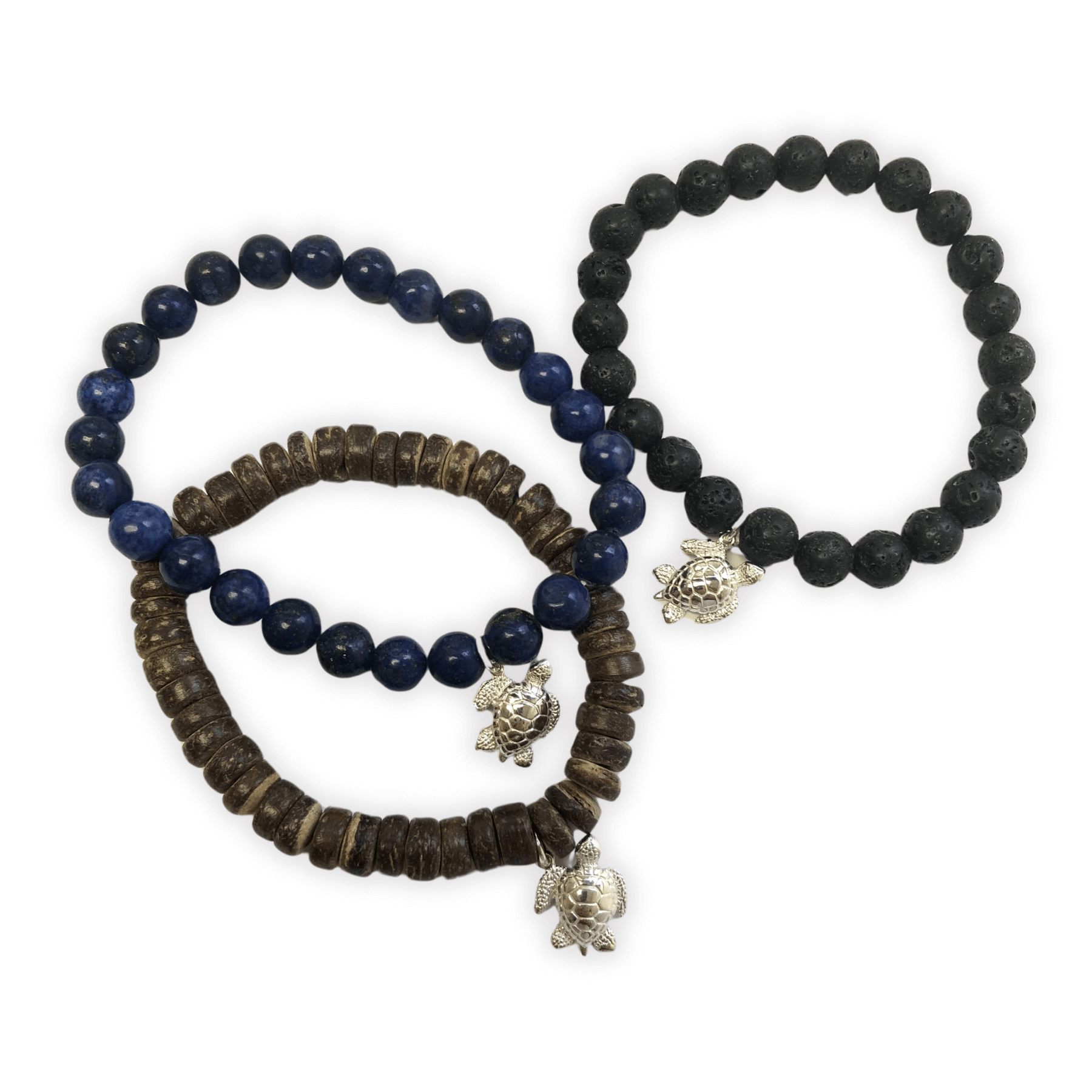 We’ve responded to the requests for more men’s jewelry styles with some arm candy! Our offering of these unique stretch/elastic bracelets are adorned with Wyland’s Sea Turtle charm in sterling. Choose from Blue Lapis, Black Lava, or Brown Coconut.