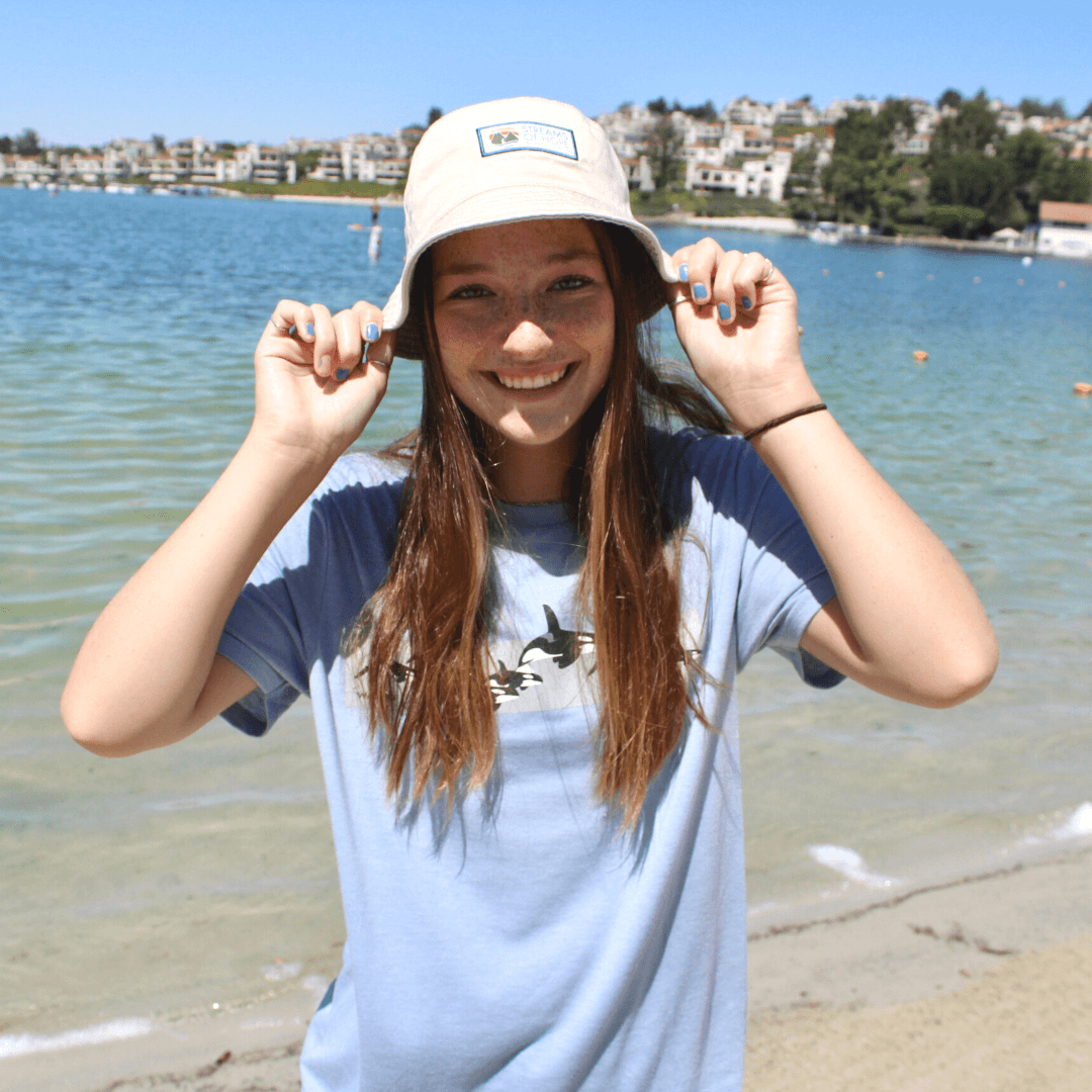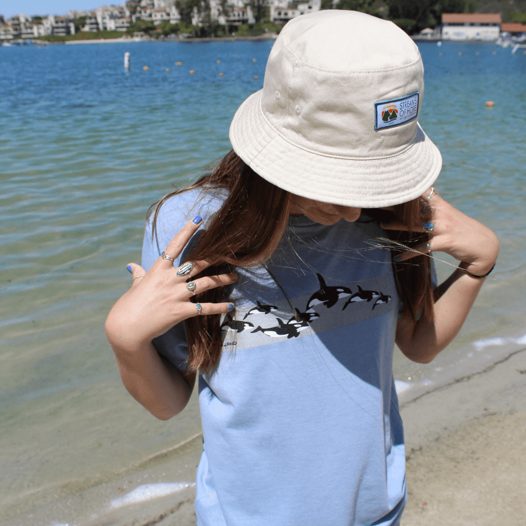 Our canvas bucket hat is super functional; it is reversible, packable, comfortable, and blocks the sun. We created this fully reversible style with two beautiful neutral cotton colors. Side one is a neutral sand color with our Streams of Hope patch. Side two is a soft gray with no patch detail. The brim is stitched in rows.